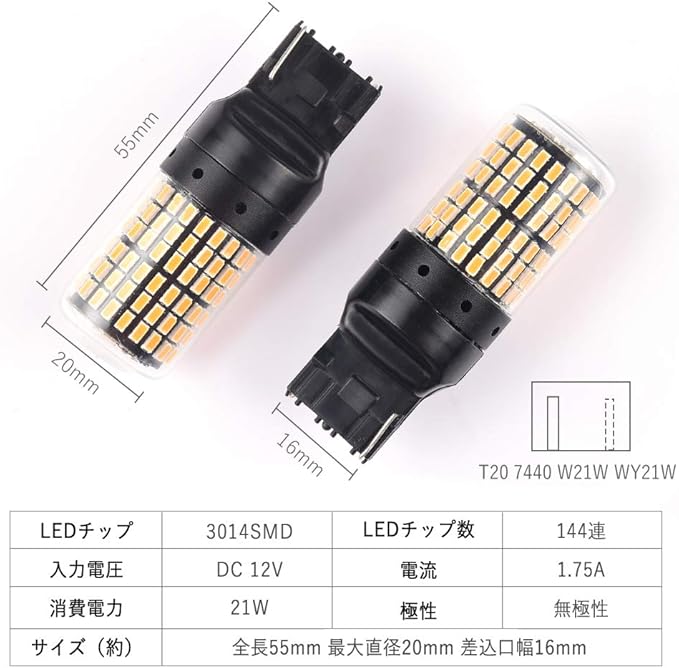 【製品仕様】ソケット:T20 シングル 7440 W21W WY21W ピンチ部違い / 発光色:アンバー / LEDチップ:3014SMD / LEDチップ数:144連 / 入力電圧:DC 12V / 電流:1.75A / 消費電力:21W / 極性:無極性 / サイズ(約) :全長55mm 最大直径20mm 差込口幅16mm / パッケージ内容:LEDバルブ 2、100日保証書 1。