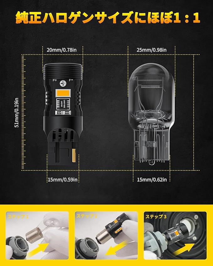 【無極性&取り付け簡単】T20ウインカーバルブの交換に最適。無極性なので、極性対応に悩まることなく、純正球と同じようにそのまま差し込むだけで簡単に交換できます。またバルブ本体は一体型、コンパクトで無加工で、純正ハロゲンを抜いて差し替えるだけ、ポン付けでウインカーのLED化が可能!!交換作業時間や手間を大幅に短縮できます。