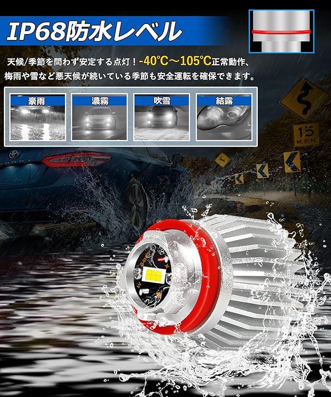 ■季節を問わず安定する点灯:IP68防水耐熱、-40℃~105℃正常動作、真夏の夜道から吹雪が続いている北海道の雪道まで、いつでも安全を確保できます。■高効率放熱で長寿命:純正より5倍放熱面積を拡大する深いヒットシンク+過熱保護回路が搭載します。純正より発熱量を20度(約)を下がる、高温によるチップの劣化を効率的に防止するため30000時間使用寿命を確保できます。