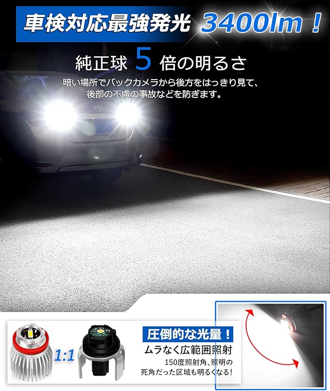 ■純正サイズ&ポン付け:TOYOTA純正ledバックアップランプを利用する限り交換可能な純正交換用LEDバックランプ。純正バルブ発光位置、角度調整不要&配線加工不要、バックバルブを差し込むだけで正常に使用できます。(レンズやユニットの寸法差による特殊な状況を防止するため、角度調整機能が保留しました。)■角度調整用工具が付きます。