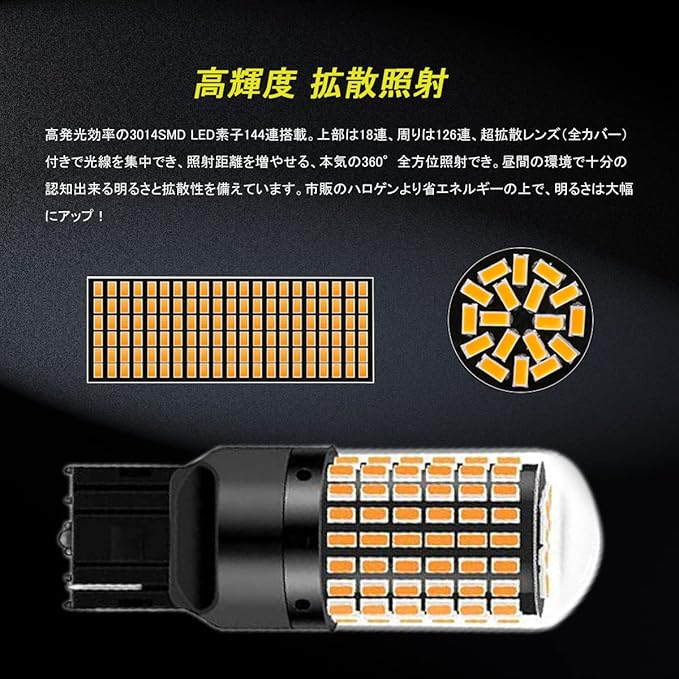 T20 ピンチ部違い LED ウインカーバルブ アンバー ジ キャンセラー 抵抗内蔵 7440 W21W WY21W リア フロント シングル LED ウインカーバルブ 3014SMD 144連 4個入