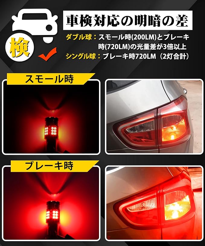 【3倍明暗の差、車検OK】光量:スモール時200lm、ブレーキ時720lm。照度変化がミラー越しにも一目瞭然の明暗の差、テールランプとストップランプのオン/オフをはっきりで後続車の追突を効果的に防止。車検対応可。