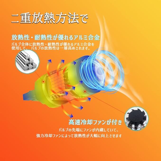 【優れる耐熱性 放熱性】ニ重放熱方法で、冷却ファン付き、高速 静音の冷却ファンが搭載されていて、バルブの全体にも航空用のアルミ合金素材を採用しているので、耐熱性 放熱効果が抜群になるため、安定した発光が可能です、また、熱に弱いLEDチップも保護でき、長寿命、長持ちが実現できます。