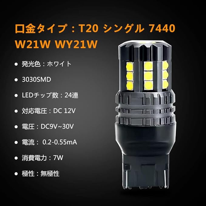 【型番】 T20シングル球 LED ホワイト、 3030チップ搭載、極性なし、 消費電力:7W 、動作電圧:DC12V-20V、動作電流: 0.2-0.55mA、色温度:6000K- 6500K、 動作温度環境:-35℃~+120℃ 、 材質: 航空アルミ 、パッケージ内容:2個入り定電流回路搭載なので、車両電圧の変化に影響されず、安定した点灯を持続します。