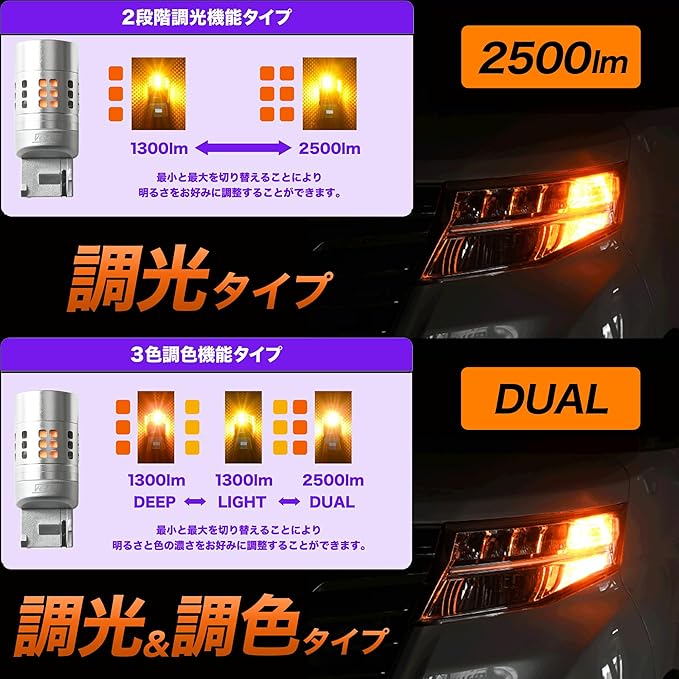 VELENO T20 LED ウインカー 実測値 2500lm 明るさ調整可 調光機能 ハイフラ防止 抵抗内蔵 冷却ファン搭載 ピンチ部違い ステルスバルブ 12V 車検対応 アンバー 調光 w015 (T20 ピンチ部違い)