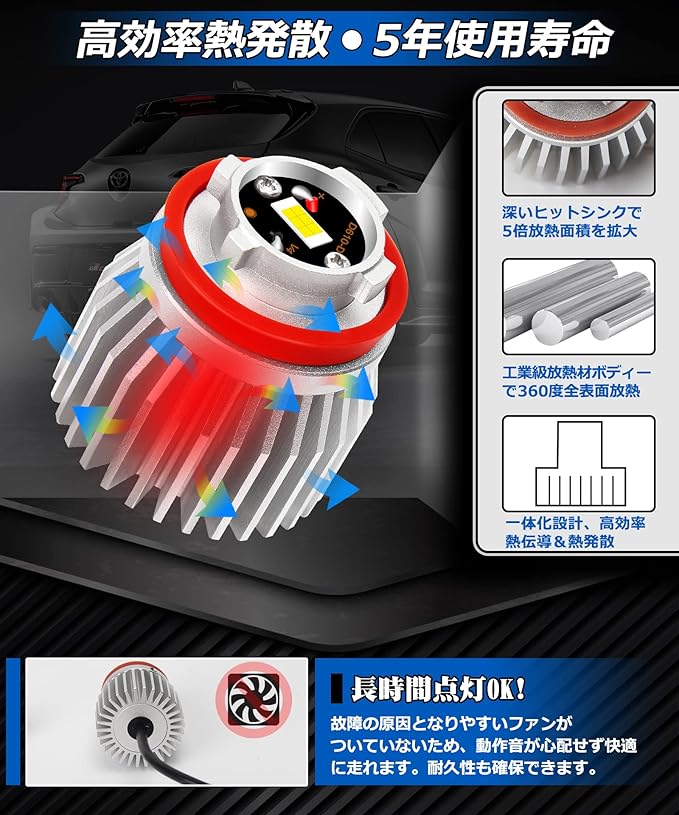 ■季節を問わず安定する点灯:IP68防水耐熱、-40℃~105℃正常動作、真夏の夜道から吹雪が続いている北海道の雪道まで、いつでも安全を確保できます。■高効率放熱で長寿命:純正より5倍放熱面積を拡大する深いヒットシンク+過熱保護回路が搭載します。純正より発熱量を20度(約)を下がる、高温によるチップの劣化を効率的に防止するため30000時間使用寿命を確保できます。