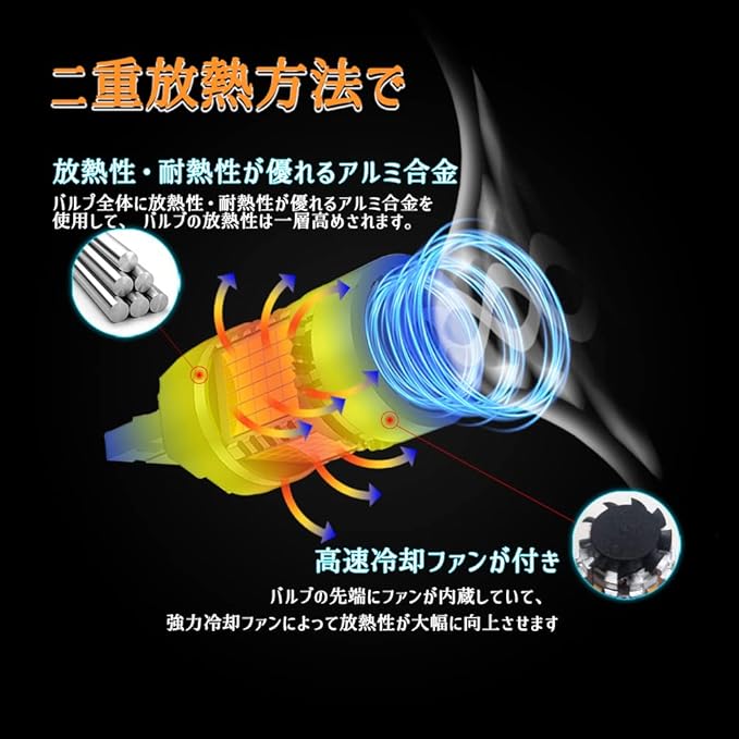 ニ重放熱方法で、冷却ファン付き、高速 静音の冷却ファンが搭載されていて、バルブの全体にも航空用のアルミ合金素材を採用しているので、耐熱性 放熱効果が抜群になるため、安定した発光が可能です、また、熱に弱いLEDチップも保護でき、長寿命、長持ちが実現できます。