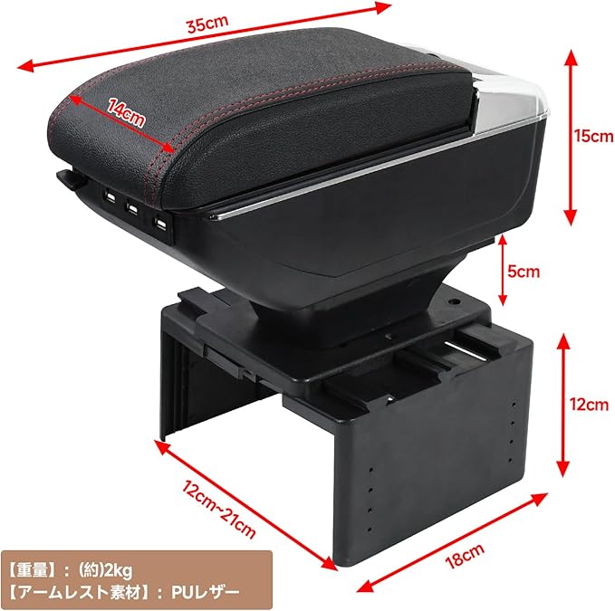 【商品内容】:車のアームレストボックス【サイズ】:(約)35cm 32cm 18cm【高さ調整】:(約)27cm/32cm【幅調整】:(約)12cm~21cm【総重量】:(約)2.3kg【材質】:本体:ABS樹脂;アームレスト部分:高品質PUレザーとメモリーパッド