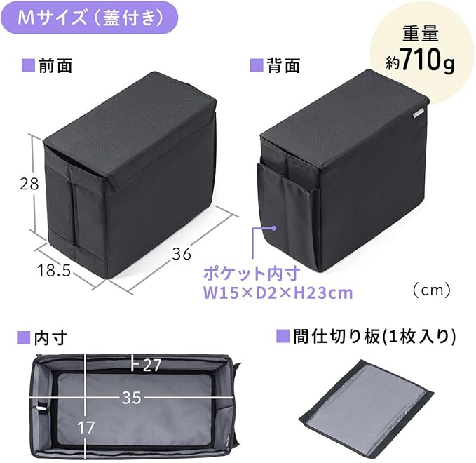 可動式の仕切り板付きで、ボックス内の幅を調整することができます。