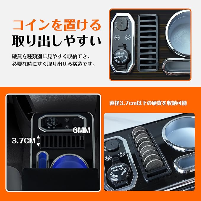 【大容量 車 収納ボックス|超強収納力+小銭整理】 ABS樹脂とPVC合成皮革を採用した耐久性の高い 車 収納ボックス。スマホ・財布・ドリンク・腕時計・イヤホンなどをまとめて収納できる大容量設計に加え,駐車料金や高速のICなどで役立つ車載コインストレージ小銭整理 機能を搭載。硬貨を種類別に見やすく収納でき、必要な時にすぐ取り出せる構造です。無駄な探す時間を削減し、スムーズな支払いを実現する 車 便利グッズ です。実用性の高い 車 収納 アクセサリーとして、車内の散らかりを一瞬で解消します。