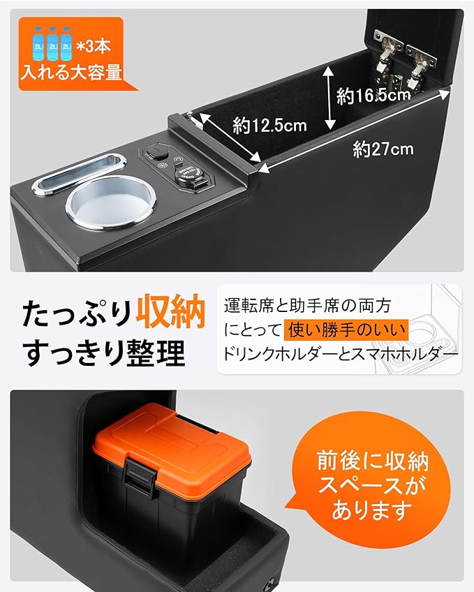 【抜群の収納力&快適な肘置き】純正アームレストより収納スペースを拡大した2026新型ルーミーコンソールボックスはスマホ・ドリンク・小物類などをすっきり整理できます。PUレザー調の高級質感と、適度なクッション性を持つアームレスとしては、見た目も触り心地も上質で、長距離ドライブの快適性を大幅に引き上げます。
