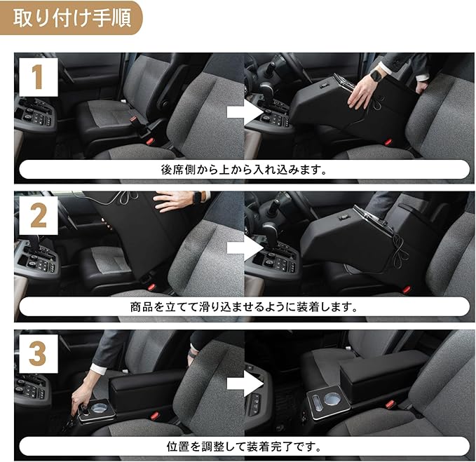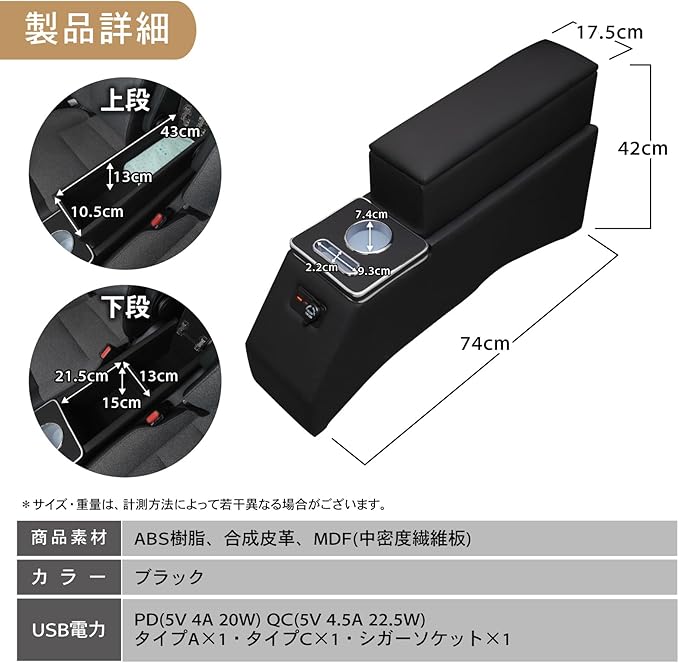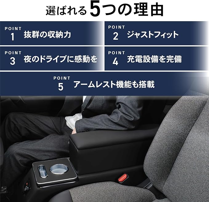 Point4 「充電設備を完備」 前面にはタイプA、タイプC差し込み口を各1つずつ配備 シガーソケット差し込み口も配備 Point5 「アームレスト機能も搭載」 アームレストがあるだけで運転の乗り心地が段違い変わります。