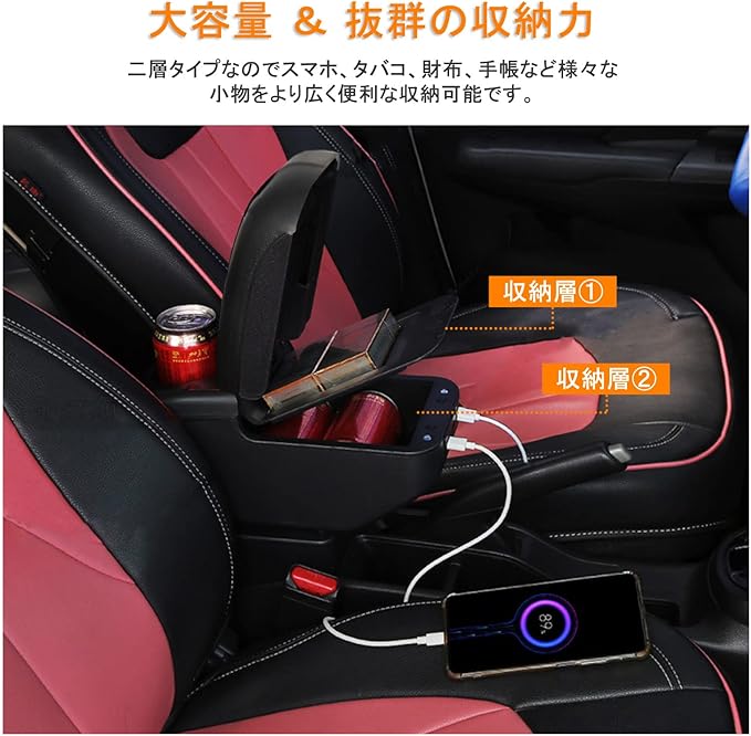 2代目 E12 ノート用の車用アームレスト 車内大容量収納ボックス センターコンソールボックス 二層タイプ 小物入れ Note e-POWER NISMO ニスモ コンソールボックス 2016.11-2020.11現行 後期型 USB充電ポート付き 車種専用設計 長距離運転最適 内装パーツ 簡単組立 ブラック