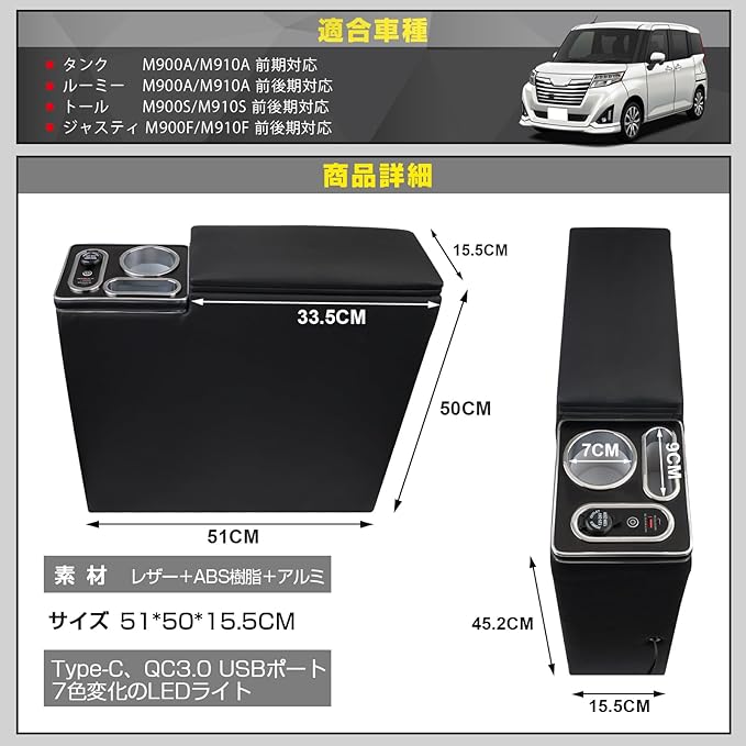 【適合車種】コンソールボックスはダイハツ トール 前期(平成28年11月〜)後期(令和2年9月〜)トヨタ ルーミー タンク 前期(平成28年11月〜)ルーミー 後期(令和2年9月〜)スバル ジャスティ 前期(平成28年11月〜)後期(令和2年9月〜)全グレード対応する。アームレスト本体のサイズは51*49*15cmです。※:車種やサイズをご確認の上ご購入ください。
