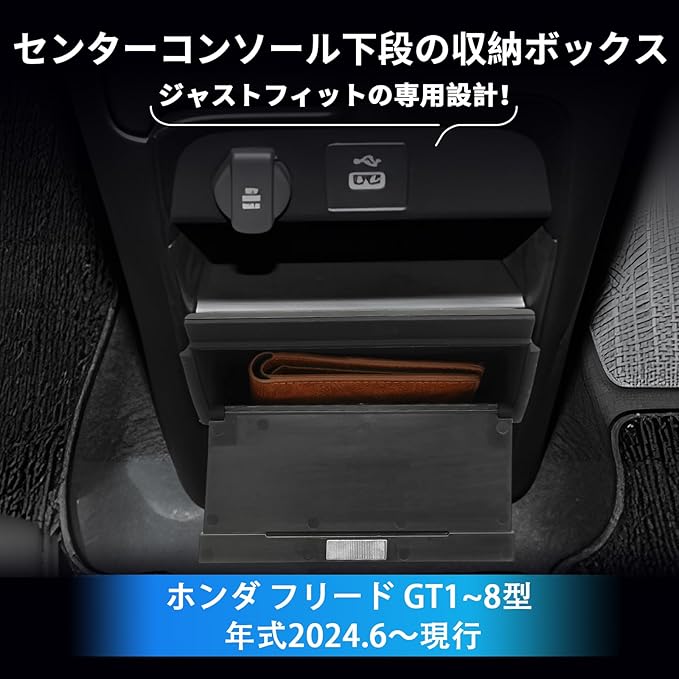 【対応車種】新型 ホンダ フリード GT1/2/3/4/5/6/7/8型。年式2024.6~現行。車種ごとの精密なサイズ設計により、純正収納ボックスにぴったりフィット。違和感なく車内に馴染み、高級感をプラスします。