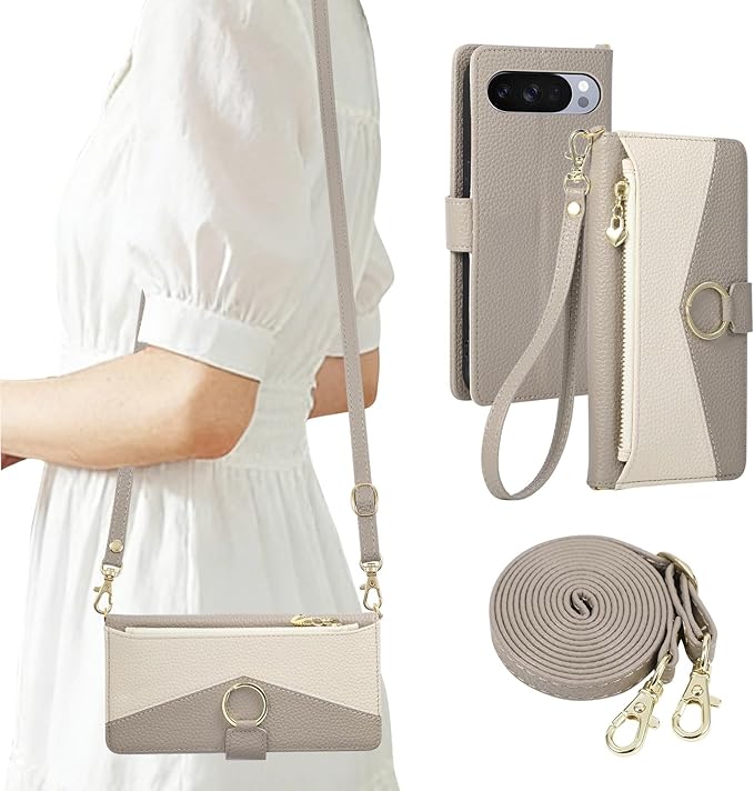 Google Pixel 10 / 10 pro ケース 手帳型 グーグルピクセル10 ケース 手帳型 ショルダー リング付き スマホケース ピクセル10pro 用 手帳型ケース おしゃれ 2色パッチワーク 6.3インチ対応 Pixel10 携帯カバー かわいい 女性 シンプル カード収納 小銭入れ 財布型 肩掛け 斜め掛け スタンド機能 落ち着いた色(グレー)