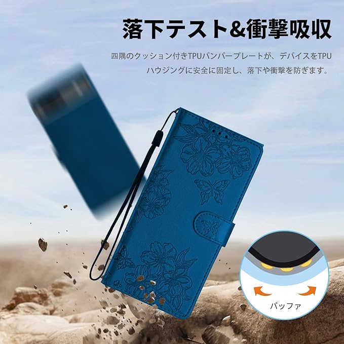 for Google Pixel 10/10 Pro ケース 手帳型 Pixel 9/9 Pro ケース 財布型 グーグルピクセル10スマホケース Googleピクセル10 Pro 携帯カバー 花柄 カード収納 高級レザー 耐衝撃 全面保護 スタンド機能 ストラップホール付き おしゃれ桜蝶 ストラップ - ブルー