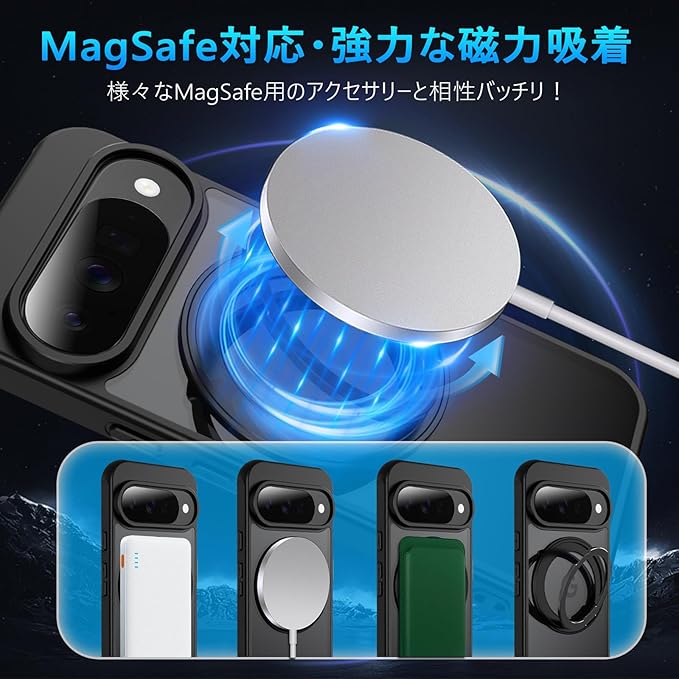 QUEASON【Google Pixel 10/10Pro 通用 MagSafe対応 ケース】360 回転スタンド ワイヤレス充電対応 pixel10 pro 用 ケース リング付き 米軍MIL規格 ピクセル10 用 スマホケース magsafe 超強磁力 落下防止 グーグルピクセル10 スマホケース 耐衝撃 半透明 防指紋(ブラック)