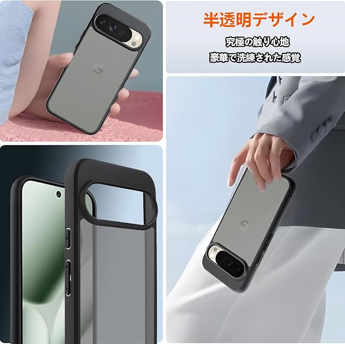 【高品質PC+TPU素材】ピクセル10 pro XLケース 半透明頑丈PC背面+ 黒色柔らかいTPUの組み合わせ、四隅の内側のエアクッションが衝撃を吸収します を全方位に保護する非常に高い耐衝撃性を持っています,ソフトとハードの間くらいの硬さで丁度いい感じです。つけたり取ったりしやすい。ストラップホールがあります