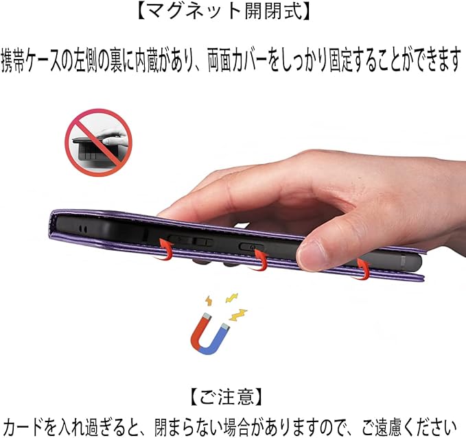【カードポケット付き】:財布型ケースとして、名刺やお札などを入れるカードポケットがつき、ちょっとしたお出かけにもスマホケース一つでOK!日常生活に便利です。ただし、カードを入れ過ぎると、閉まらない場合がありますので、ご遠慮ください。