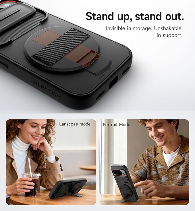 SURITCH 対応Google Pixel 10/10 Pro ケース 360 回転式ハンドストラップ スマホグリップホルダー & インビジブルキックスタンド & スライドカメラカバー付き 頑丈な耐衝撃保護カバー - ブラック
