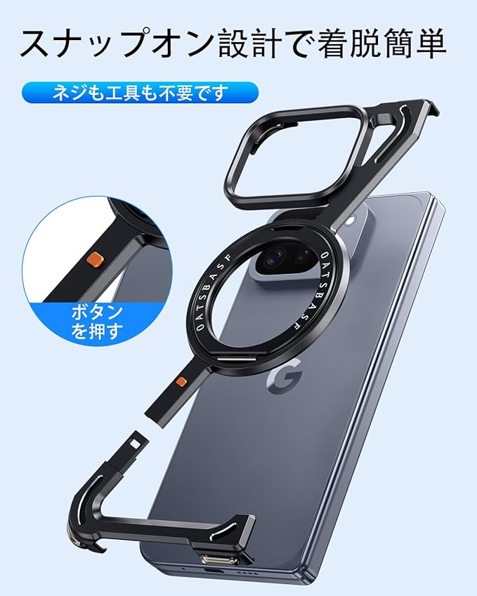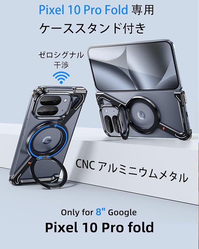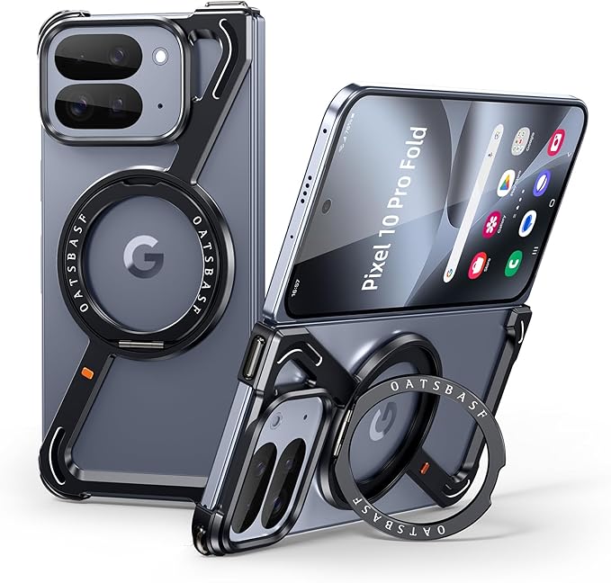 OATSBASF Google Pixel 10 Pro Fold 用のケース MagSafe対応360 回転スタンドカバー 縦横両対応 収納式折りたたみスタンド アルミバンパー 金属グーグル ブラック