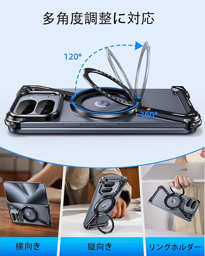 安定性抜群の隠し式スタンド:ケースは航空機級アルミニウム素材で補強されており、スマホを安定的に支えることができます。隠し式スタンドは 360 回転と 120 折りたたみに対応し、角度を自由に調整して様々な使用ニーズに応えます。