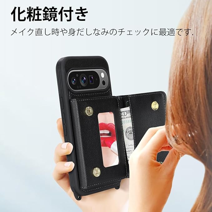 対応 Google Pixel 10 ケース ショルダー グーグルピクセル10 ケース カード収納 鏡 肩掛け 斜めかけ スマホショルダー ピクセル10 Pro ストラップ付き 耐衝撃 調節可能な 携帯ケース pixel 10 Pro - ブラック