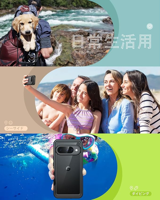 【強防衝撃力・360 保護】軍用MIL規格810G-516防振材料が採用されていますので、衝撃にとても強いです。防水ケースの嵌め込み式前カバーと透明バックカバーの組み合わせにより、360 全方位からPixel 10を保護してくれます。落下、衝撃、擦れ傷など一切心配ありません。粉塵も中に入らない、砂や埃が舞う過酷な環境でも端末をしっかり包んで保護します。