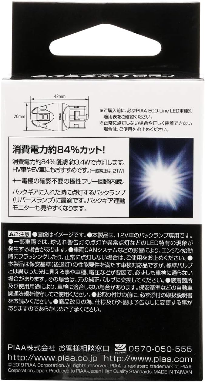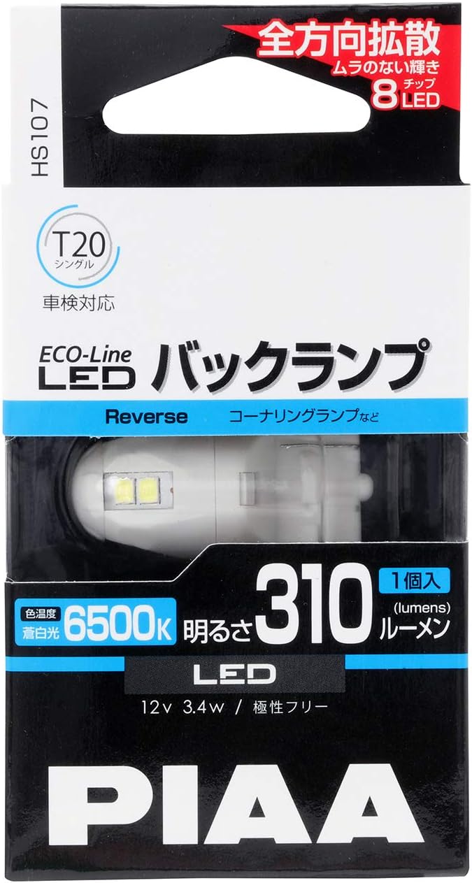 PIAA(ピア) 車用 バルブ バックランプ/コーナリングランプ用 LEDバルブ T20シングル 6500K 310lm ECO-Lineシリーズ_車検対応 1個入 12V/3.4W 極性フリー 全方向拡散8チップ HS107