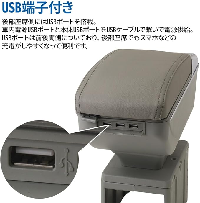 USB端子付き/後部座席側にはUSBポートを搭載。車内電源USBポートと本体USBポートをUSBケーブルで繋いで電源供給。USBポートは前後両側についており、後部座席でもスマホなどの充電がしやすくなって便利です。電源供給がされているポートは青色LEDが点灯します。