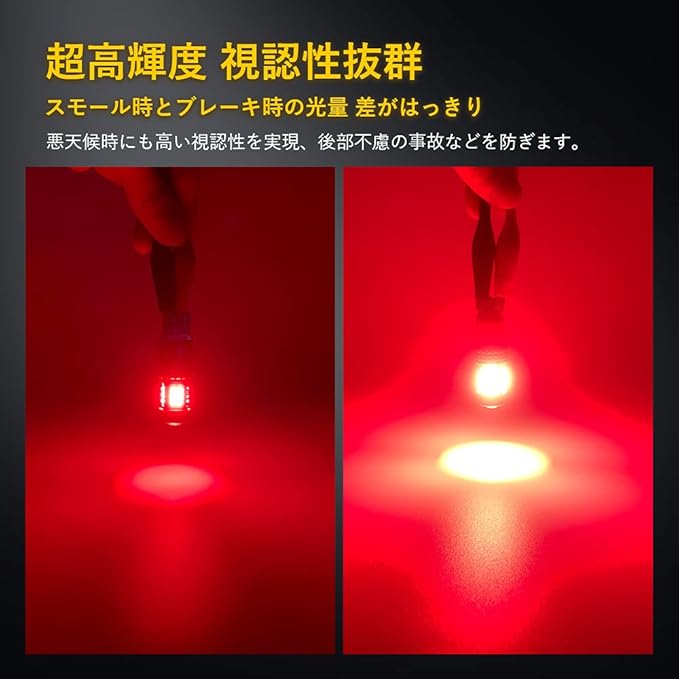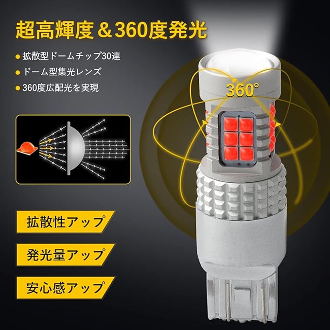 【超高輝度&360度発光】超高発光効率の新型半球ドームチップを採用!トップにプロジエクターレンズを搭載、視認性がアップします!5面の発光設計、360度全方位に照射できます。ブレーキ時の明暗の差ははっきり、悪天候時にも高い視認性を実現、後部不慮の事故などを防ぎます。