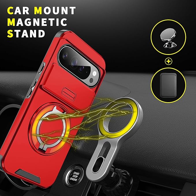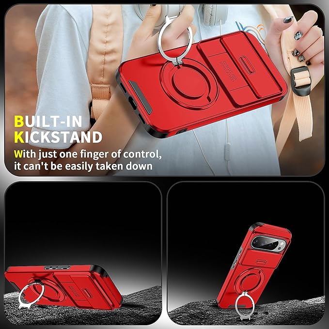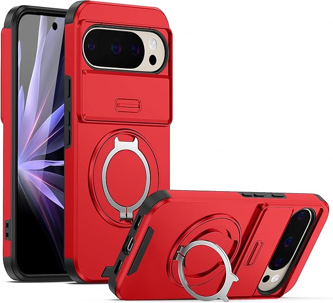 Pixel10 Pro XL 対応 ケース 【横縦両立・多機能360度回転スタンド】 リング 耐衝撃 薄型 TPU+PC 車載ホルダー レンズ保護 フィット感 防指紋 おしゃれ ストラップホール付き 落下防止 防塵 グーグル ピクセル10 プロ XL 対応 カバー 6.8インチ レッド JMJP15-3