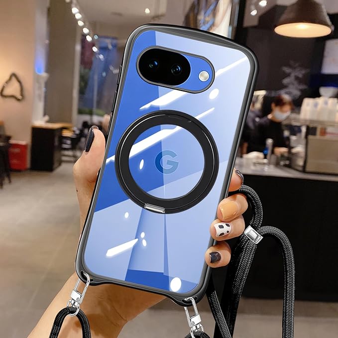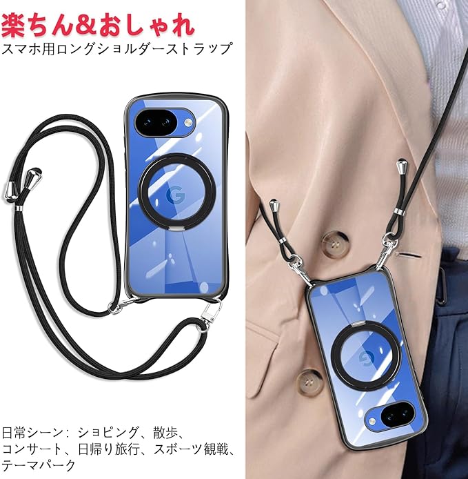 Google Pixel 10a 用の ケース クリア リング付き ショルダー 多機能360度回転スタンド ピクセル10a スマホケース カバー 耐衝撃 透明 TPU 肩掛け 首掛け スタンド機能付き マグネット 金属ボタン(ブラック)