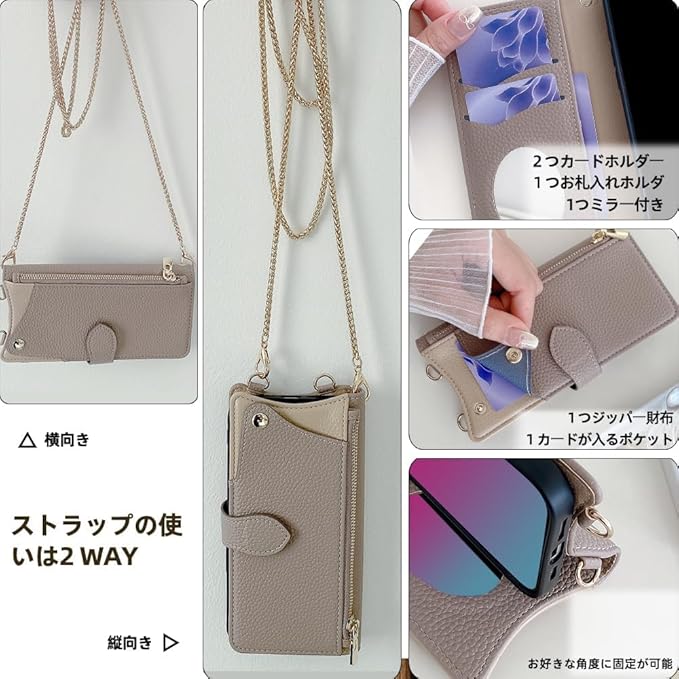 快適な持ち心地と使いやすさ: 付属クロスボディチェーン、全長120 cm。金具の装飾が美しさと上品さを漂わせてます。斜めがけ、肩掛け、通勤、旅行、犬の散歩、山登り、海へ行く、買い物、外食、重い荷物を持っている時、子供を連れて外出する時もスマホを紛失すること心配なく両手が解放されます。また、マグネット式の留め具により、片手で簡単に開閉ができ、スタンド機能も兼ね備えています。