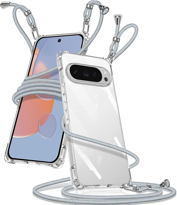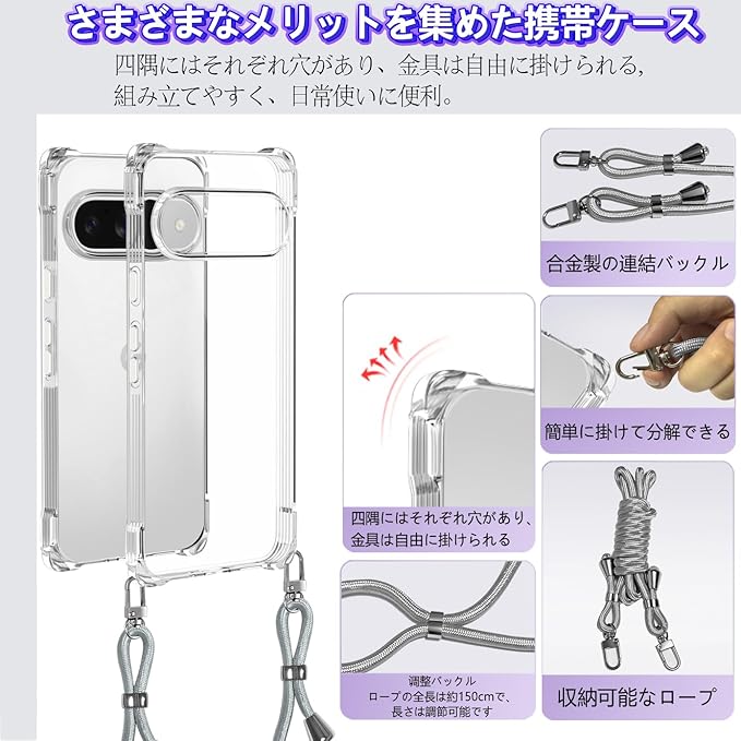 用の Google Pixel 10/Pixel 10 Pro ケース クリア ショルダー ピクセル10 カバー 肩掛け 斜めかけ 縄掛けケース 透明 薄型 軽量 TPU 携帯ケース 紐付き 長さ調整可能 取り外し可能 落下防止 紛失防止(シルバー)