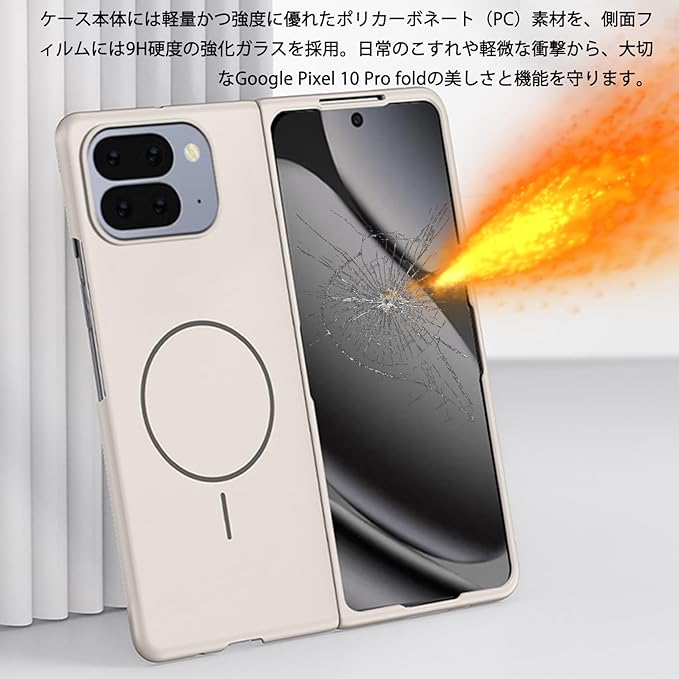 【超薄本体ケース+強化ガラス側面保護フィルムのセット】 厚さわずか約1mmの超薄型本体ケースと、高い耐衝撃性を誇る強化ガラス製の側面保護フィルムによるセットです。側面の縁を含むPixel 10 Pro Foldを、繊細かつ総合的にガードします。ケース本体には軽量かつ強度に優れたポリカーボネート(PC)素材を、側面フィルムには9H硬度の強化ガラスを採用。日常のこすれや軽微な衝撃から、大切なGoogle Pixel 10 Pro foldの美しさと機能を守ります。