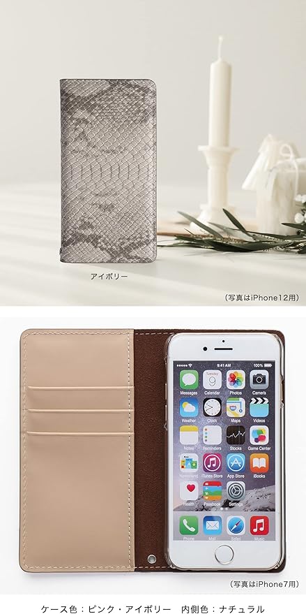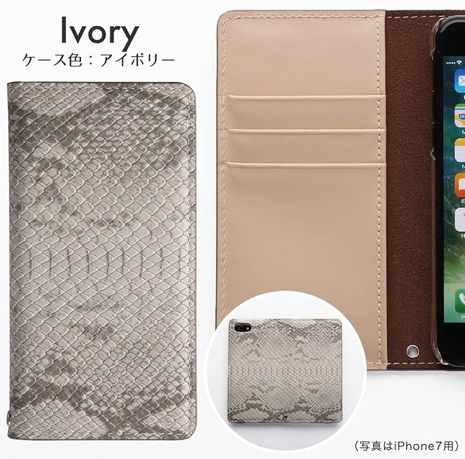 外側カバーはパイソン(大蛇柄)のPUレザー、内側カードポケットをフルグレインレザーで製作したハイブリッド(PUと本革を一体化させた)手帳型スマホケースです。傷や汚れに強いのが特徴です。ベルトが付いていないので片手でラクに開閉でき、マグネット不使用のため磁気カード等の影響も心配ありません。前面カバーは使用しているうちに馴染み、次第に閉じてくるようになります。
