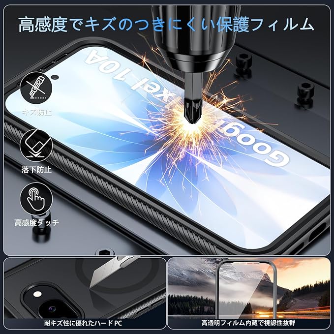 【両面カバー・簡単取り付け】TPUフレーム・背面PCパネルを組み合わせた三層構造により360 全体を保護し、透明なリアプレートがGoogle 10A 本体の本来のデザインを活かしながら傷や衝撃から守ります。また、両面全体をしっかり保護、取り付け取り外しが簡単です。