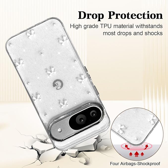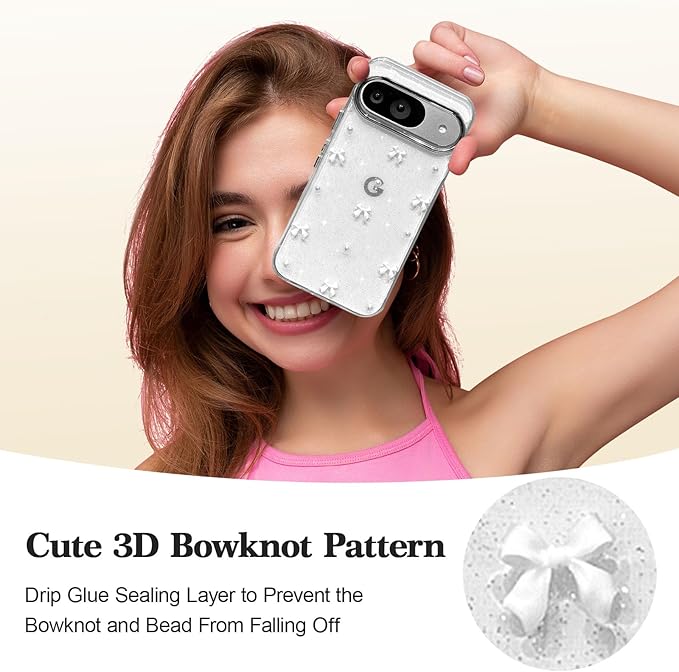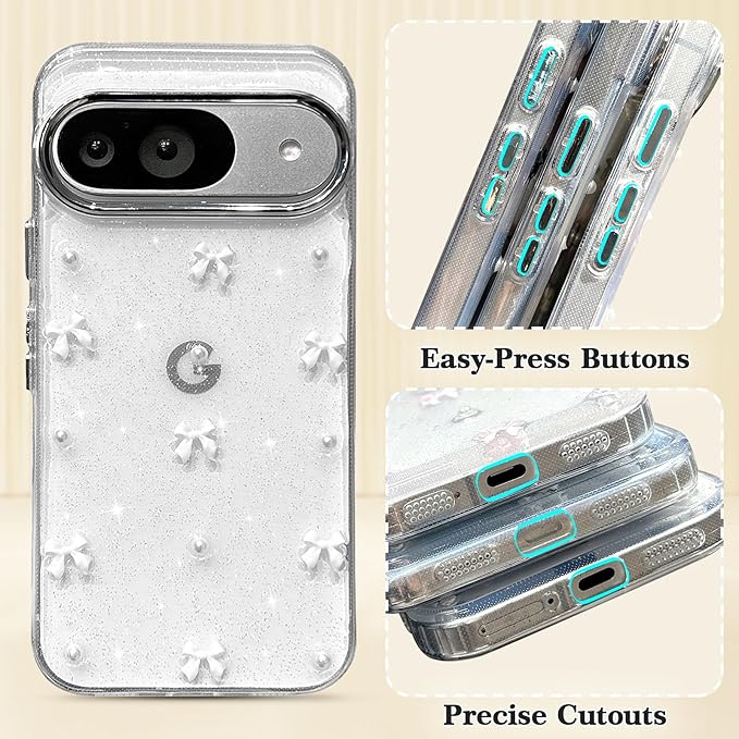 EYZUTAK ケース 対応 Google Pixel 9/9 Pro/10/10 Pro 用の 保護ケースおしゃれ 可愛い 韓国 クリア りぼん立体感装飾 きらきら ラメ入り 透明TPU薄型 軽量 耐衝撃 擦り傷防止 保護カバー - ホワイトのリボン