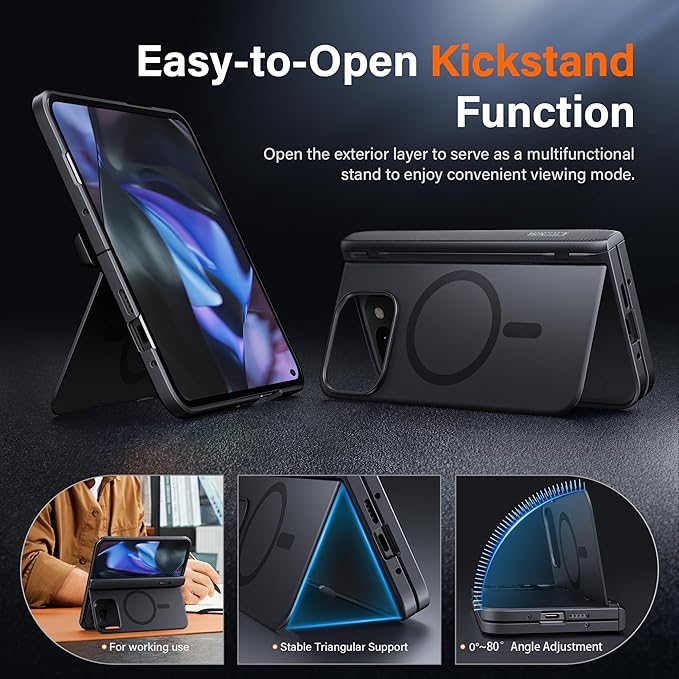 [大型隠し水平スタンド&スリムデザイン] - 当社のPixel 9pro Foldスリムデザインケースは軽量で、簡単にグリップできます。背面カバーを開けると水平スタンドになり、デスクトップに安定して置くことができます。使用しないときは隠すことができます。十分な大きさのキックスタンドを備え、ハンズフリーのFaceTimeやビデオチャットのための水平方向の安定性を高めます。