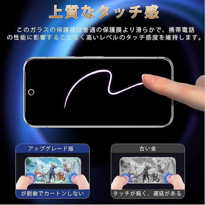 【指紋防止・高感度】ガラスフィルムの表面にナノコーティングを採用しており、特殊撥油処理を行い、スマートフォンの表面に指紋や汚れが付きにくくなっています。汚れがあっても、軽く拭くだけで新品同様のきれに戻ります。このガラスフィルムは通常のガラスよりも滑らかな手触りで、高感度で快適な操作性を備え、ゲームなどのアプリケーションに最適です。