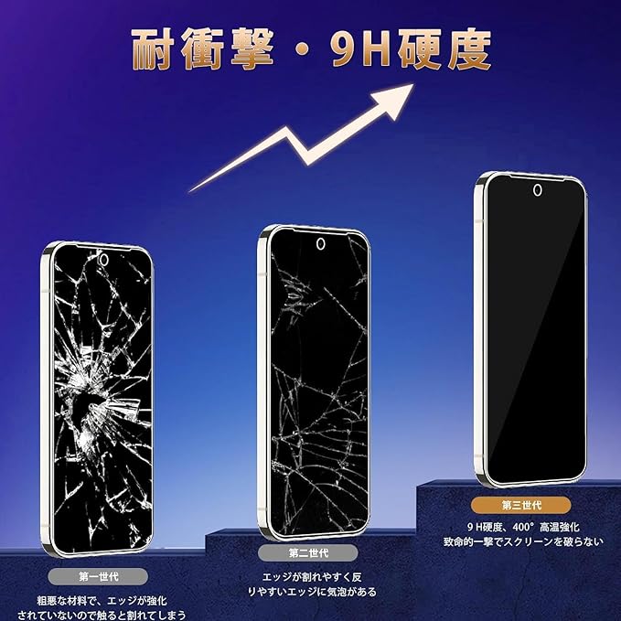 【高品質 - AGC 旭硝子素材】最高レベルの9H硬さに達しております。4.5時間の高温焼入れ処理、そして繰り返して強化と製造しております。スクリーンプロテクターの圧縮強度は125MPaに達し、通常のガラスの5倍になります。ナイフなどの鋭いものでも傷つきません。内蔵のシリコンコーティングは衝撃を抑えて、耐爆性を向上させ、スクリーンの傷を最小限に抑えます。また、この強化フィルムは飛散防止加工しており、万が一携帯電話が床に落下してガラスが割れでも、破片が飛びません。