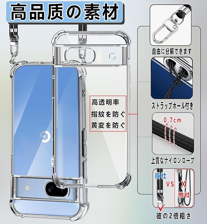 OJBSEN Google Pixel 8a ケース グーグルピクセル8a カバー [ストラップ2枚付き] 調節可能な ショルダー 肩がけ 首掛け 紐付き ストラップホール付き 薄型 透明 PC+軽量 シリコン TPUバンパー [耐衝撃 ワイヤレス充電 傷防止 全面保護 米軍MIL規格 防指紋 カメラ保護] スマホケースPixel 8a(クリア)