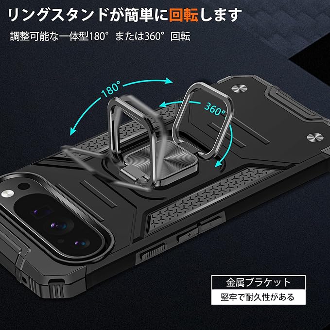 【対応機種】Mnunjiajia 対応 Google Pixel 10 Pro XL 専用 【機能性】後ろに付いているフィンガーリングはスタンド機能はもちろん、滑りにくくて持ちやすい、安定的なグリップが特徴です。リングはケースにしっかり固定されていて、縦置き、横置きどんな角度でも固定できます、360度回転可能、180角度調節可能