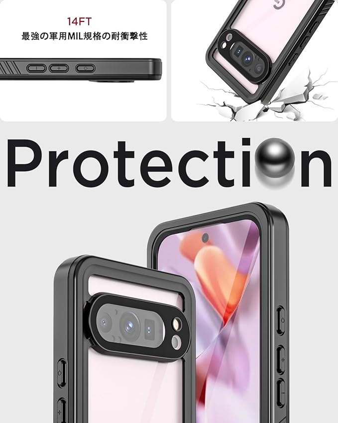 【軍用MIL規格・衝撃吸收】このGoogle Pixel9 Pro 防水ケースは軍用MIL規格810G-616防振材料で仕上げており、落下時に生じた衝撃を吸収し、本体への破損リスクを減らすことができます。頑丈な衝撃吸収フレームで衝撃に強くうっかり落としても平気です。Googleピクセル9 Pro カバーの嵌め込み式前カバーと透明バックカバーの組み合わせにより、360度からグーグル Pixel 9 Proを全面保護してくれます。完全密閉ケースで、防水に加えて塵、雪、砂、ホコリ、ゴミから、工事、建築現場や研究室などでもしっかりグーグル Pixel 9 Proを守ってくれます。