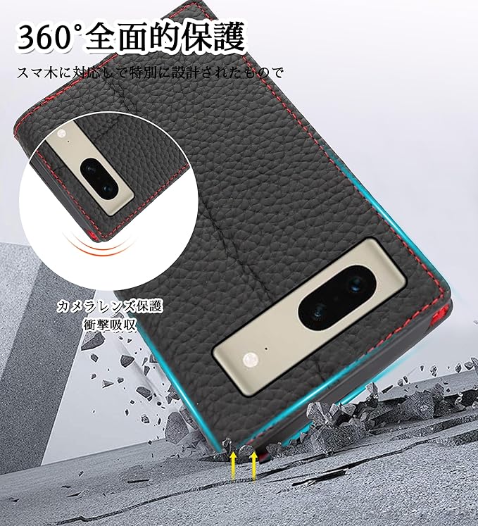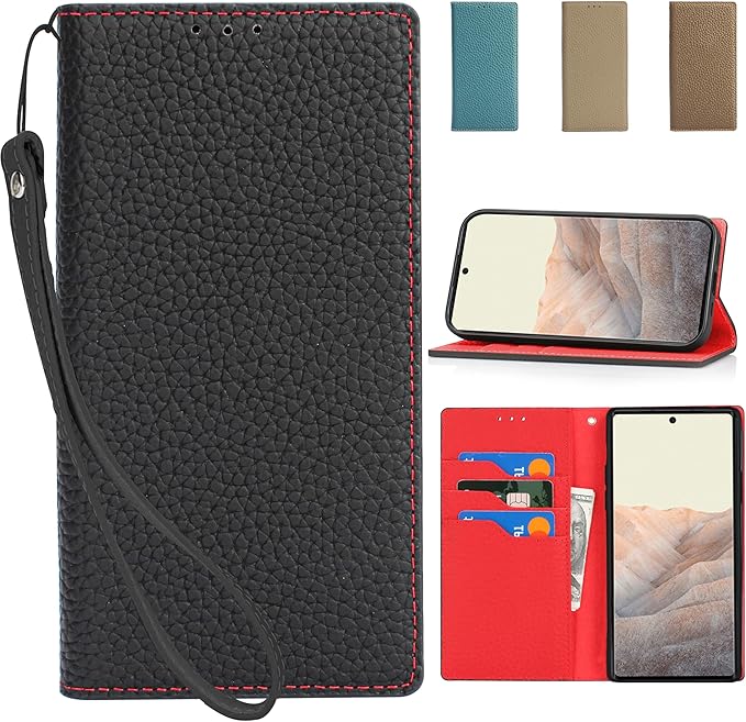 CLICSUN Google Pixel 7 対応ケース 高級 牛本革 Pixel 7 対応ケース 手帳型 グーグル ピクセル 7 対応カバー 本革 レザー カバー 全面保護 衝撃吸収 スタンド機能 ストラップ付き マグネット式 カードポケット ギフトボックス付き ブラック レッド