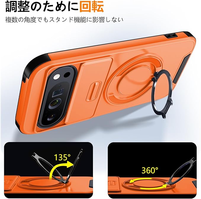 Google Pixel 9 用 ケース リング付き スライド式カメラカバー 隠しスタンド Google Pixel 9 Pro 用 ケース 耐衝撃 スタンド機能 縦横両対応 車載ホルダー PC TPUバンパー 防塵 人気 落下防止 滑り止め 指紋防止 ピクセル 9/ピクセル 9 Pro カバー オレンジ MJJ-1065-05-06