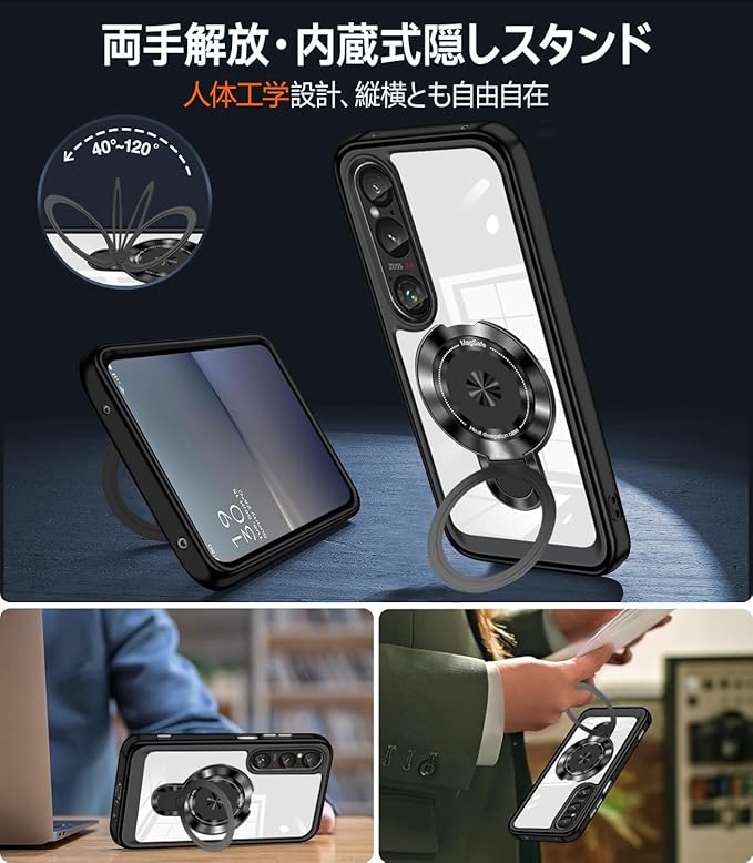 【リング付き・多機能スタンド】多機能スタンドとリング一体型の斬新なデザインです。縦置きでも横置きでも安定して支えられ、40 ~ 120 の間で多角度自由に調整できます。視聴に楽しみ、首や肩周りリラックス、指と腕の疲れ解消し,両手解放!