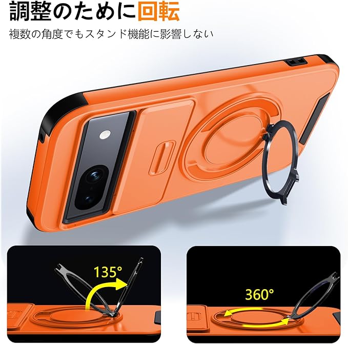 対応 Google Pixel 8A 用 ケース リング付き スライド式カメラカバー 隠しスタンド 耐衝撃 スタンド機能 縦横両対応 車載ホルダー PC TPUバンパー 防塵 人気 落下防止 滑り止め 指紋防止 ピクセル 8a カバー オレンジ MJJ-1065-06-08